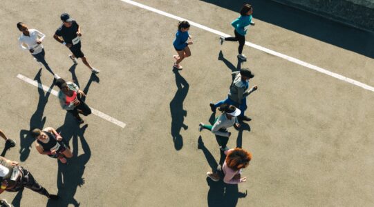 Aerial view of diverse group jogging during a race event
